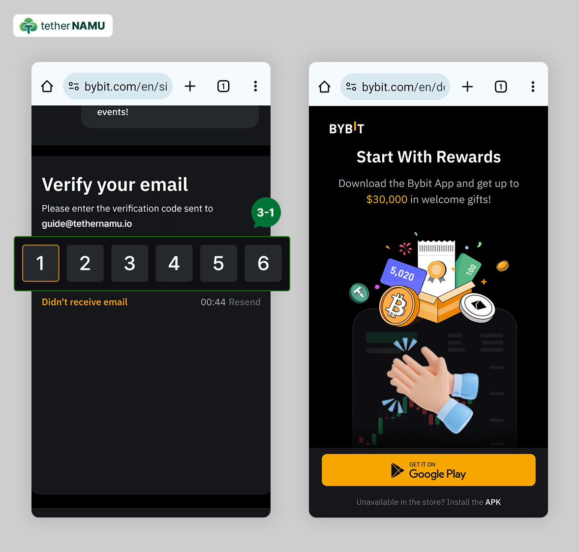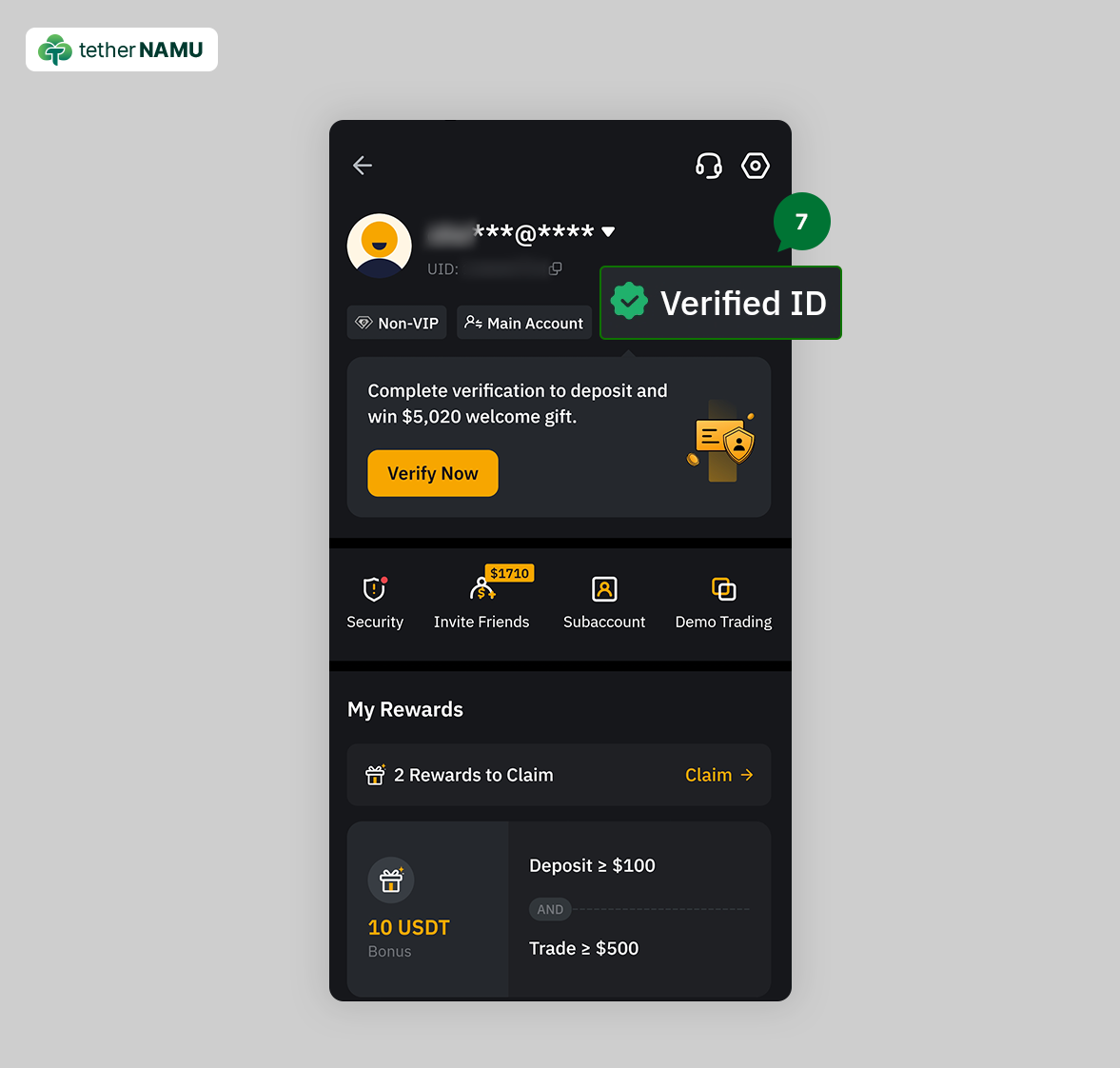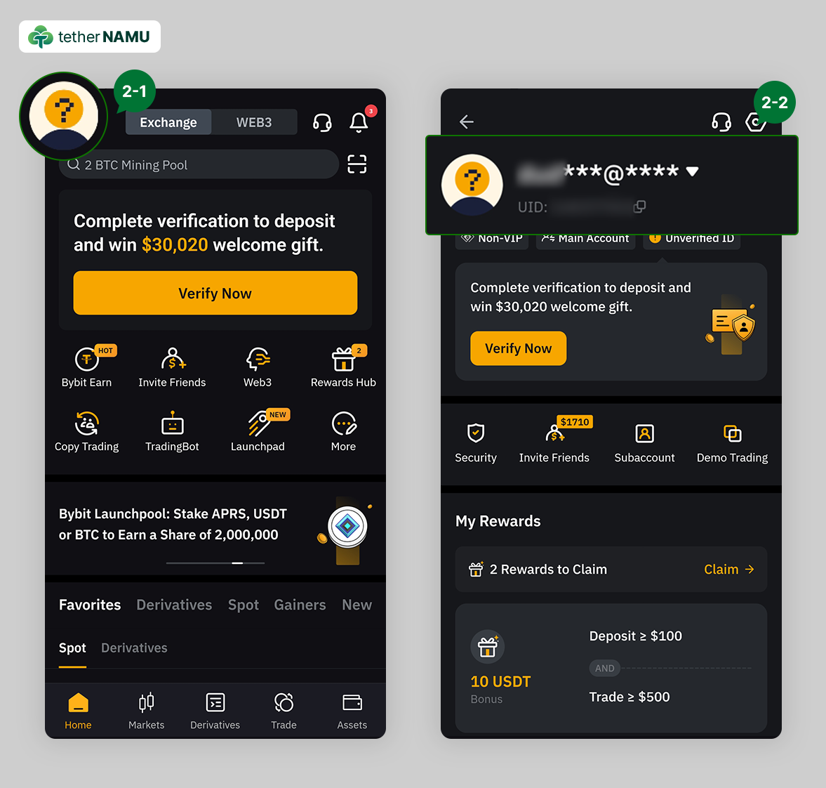 2. 레퍼럴 코드에 TETHERNAMU가 보이지 않으신다면, 1번으로 돌아가 다시 한번 가입을 진행해 주세요.