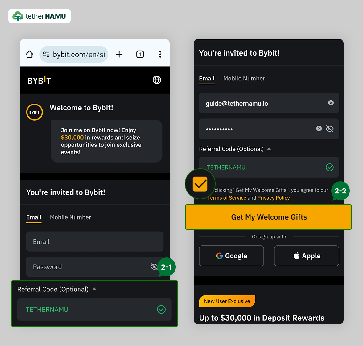 2. 레퍼럴 코드에 TETHERNAMU가 보이지 않으신다면, 1번으로 돌아가 다시 한번 가입을 진행해 주세요.