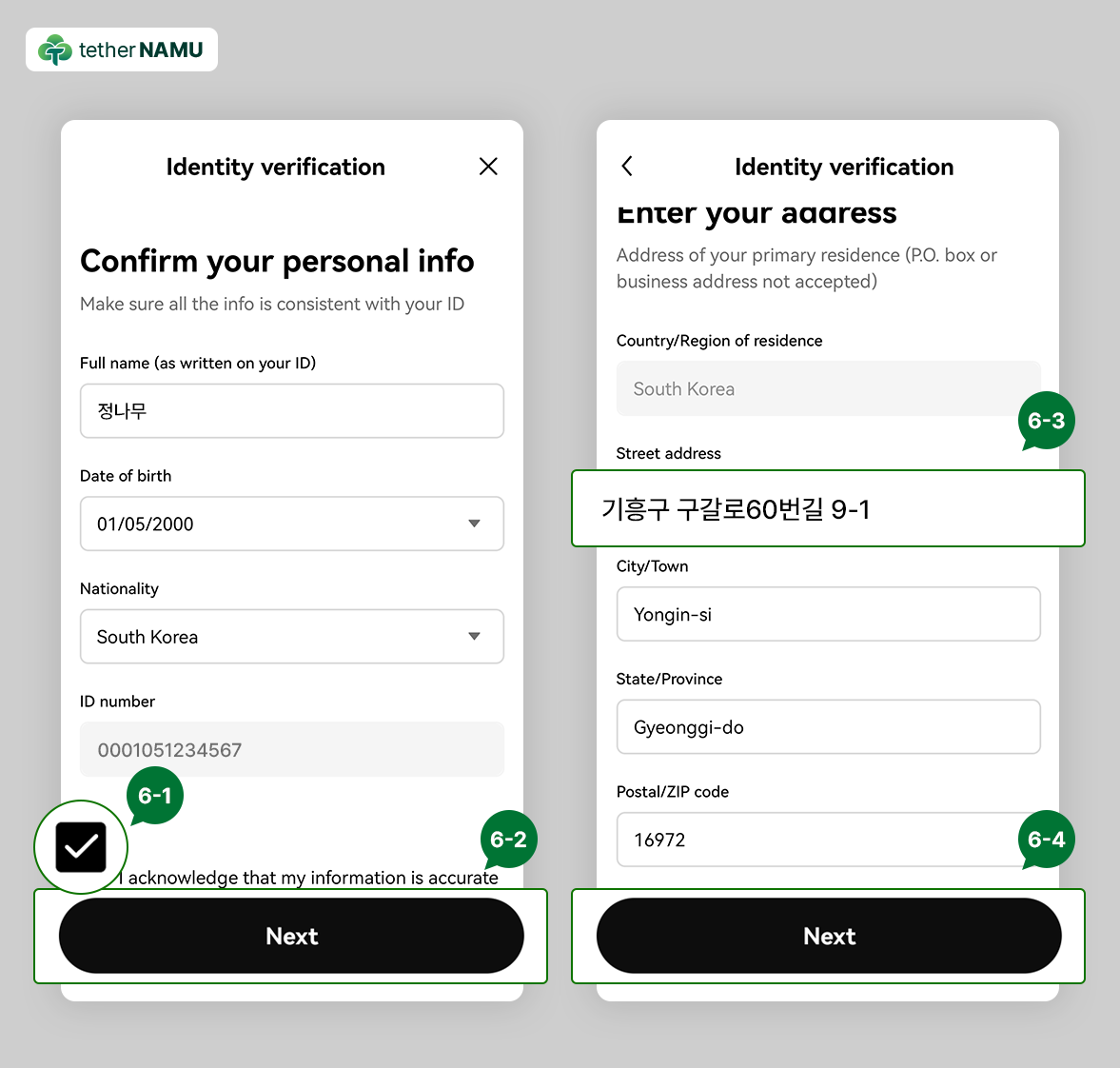 6. 트레이더님의 신분증 정보와 동일한지 확인 후, 주소지를 한글로 입력 후 본인의 영문주소를 선택해 주세요.