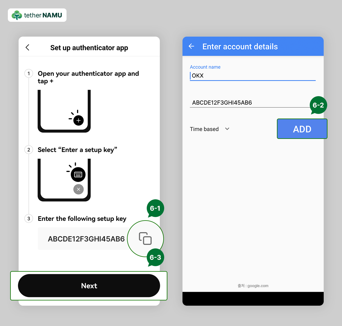 6. OKX 앱으로 돌아가서, 16-digit key(ABCDE12..)의 우측 Copy를 클릭 후, 인증기 앱으로 다시 돌아가 계정 이름에 OKX, 내 키에는 방금 복사한 16-digit key를 붙여넣고 추가를 클릭해 주세요.