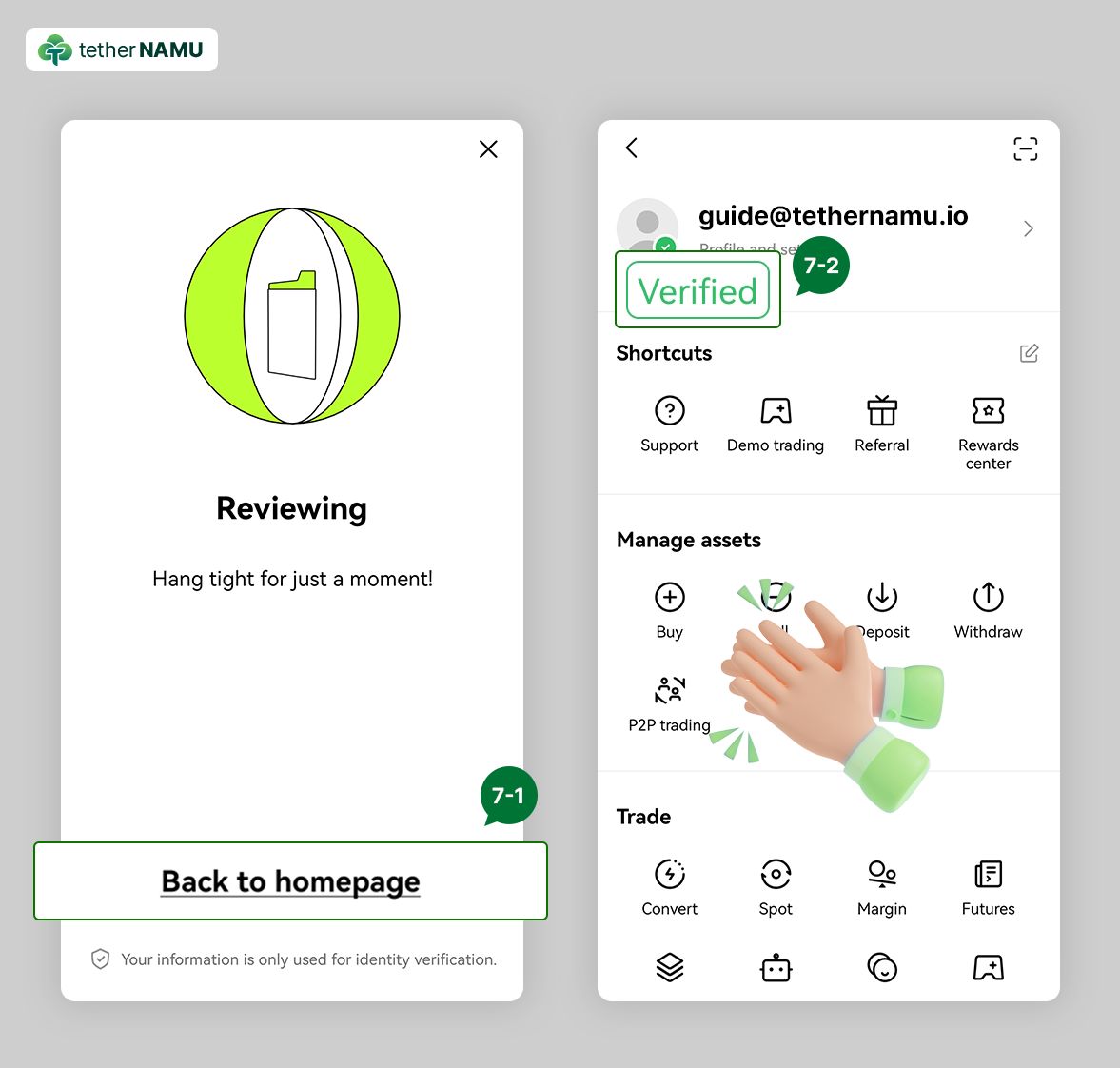 7. 모든 진행 완료! 10분 내외로 결과를 알 수 있어요. 10분 뒤 본인의 프로필에 Verified가 보인다면 KYC 등록 완료!