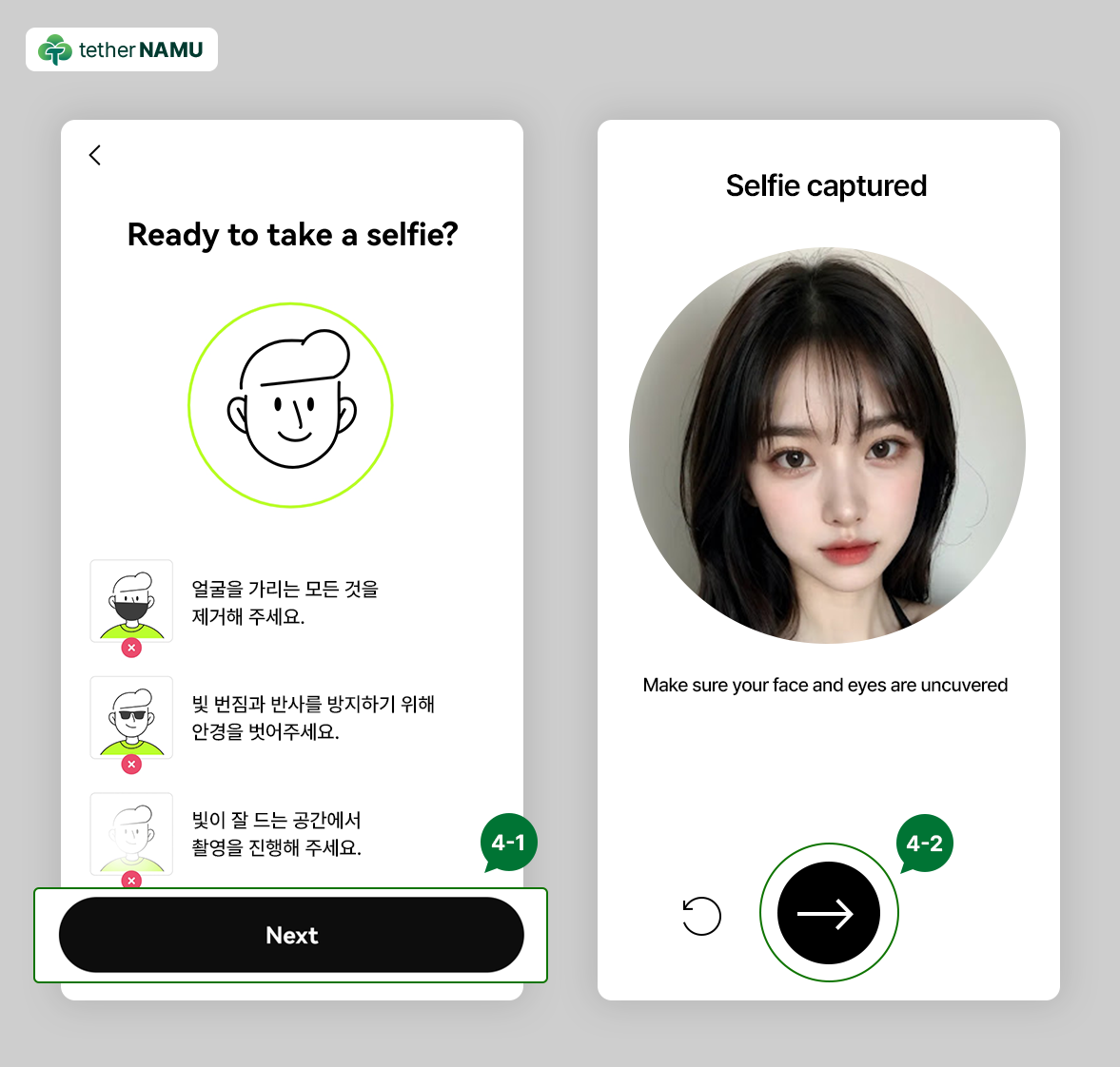 4. 이제 셀카 인증을 진행할 차례에요! 준비가 되셨다면 Next를 클릭 후, 다음 페이지에서 셀카 인증을 진행해 주세요.