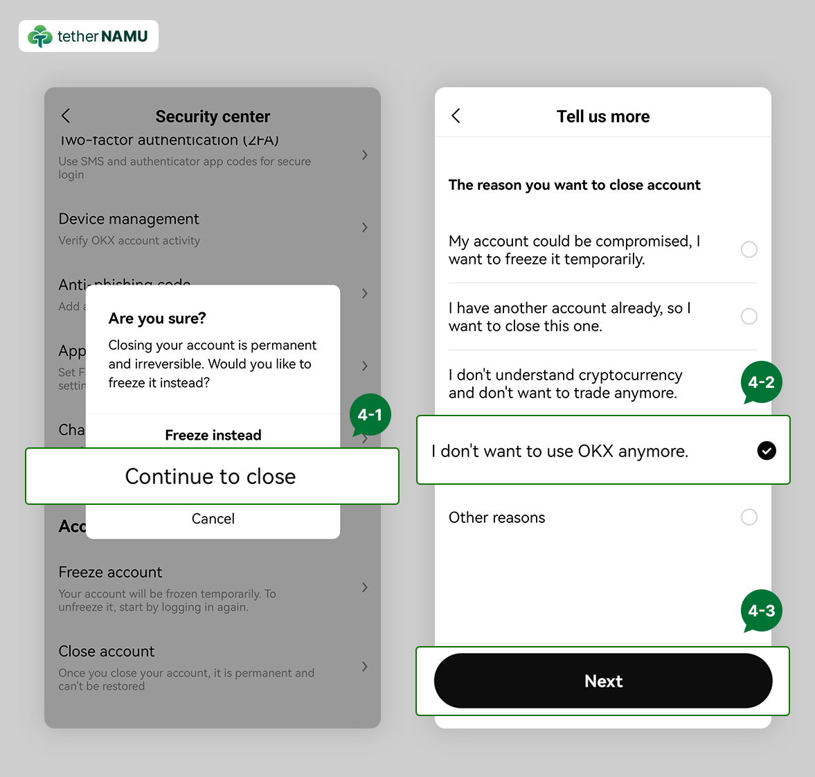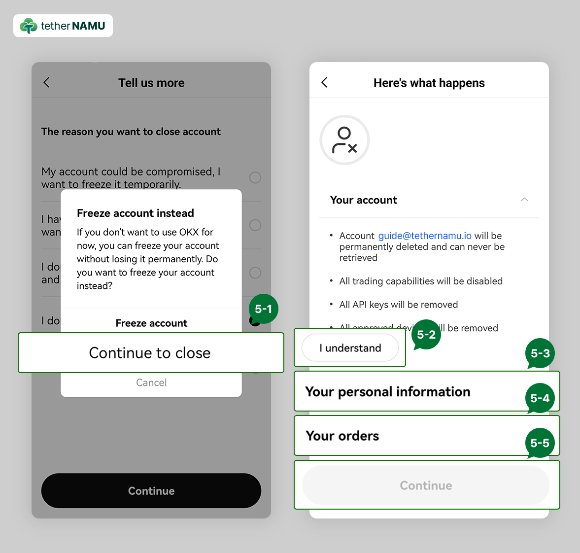 4. Continue to close를 클릭 후, I don't want to use OKX anymore.를 체크해 주세요.