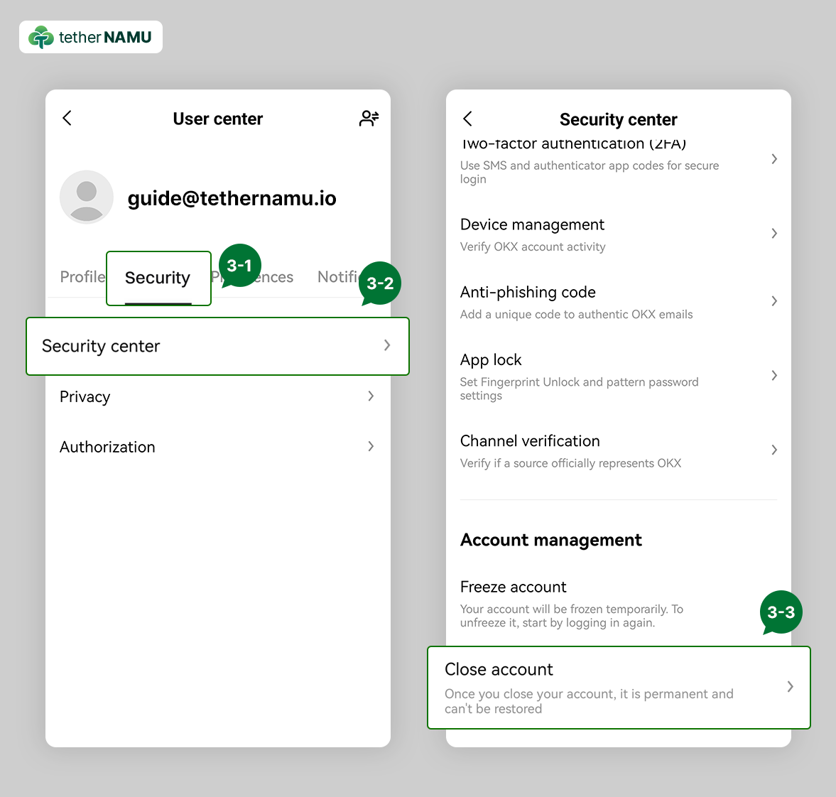 2. 좌측 상단 네모 아이콘을 클릭 후, 다음 페이지에서 사람 모양 아이콘 또는 본인의 프로필을 클릭해 주세요.3. Security 탭에서 Security Center를 클릭 후, Close account를 클릭해 주세요.