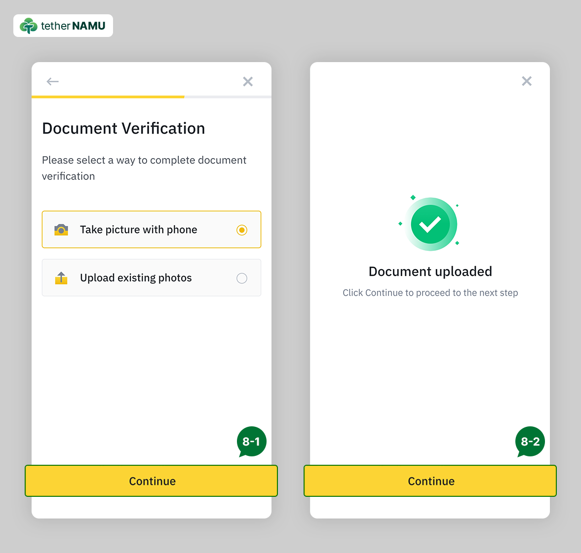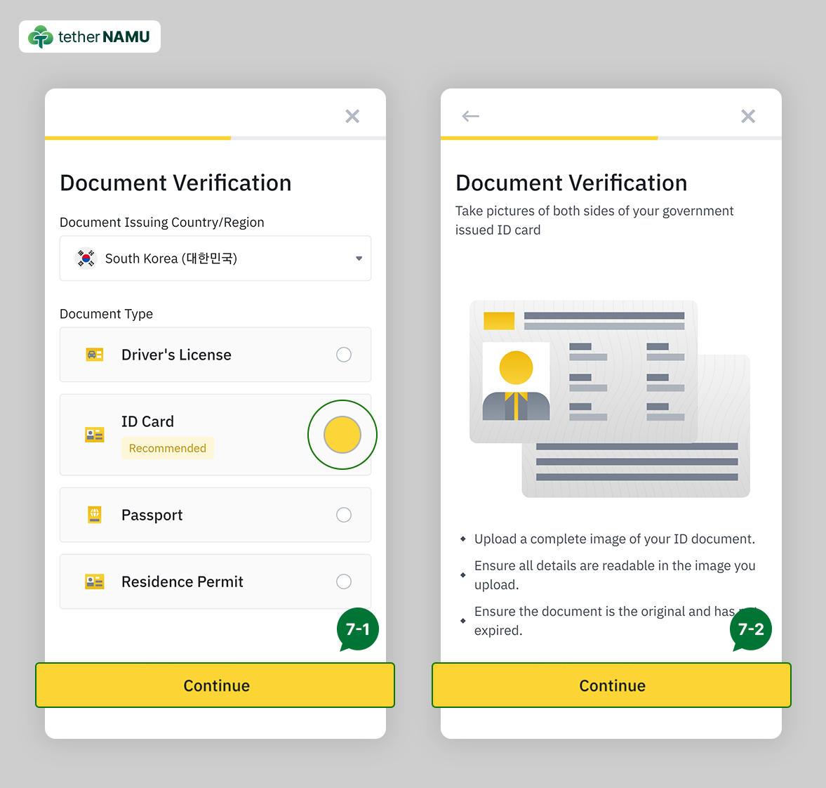 7. 트레이더님이 편하신 신분증을 한가지 선택해 주세요. 이제 신분증을 인증할 차례에요! 신분증이 준비되셨다면 Continue를 클릭해 주세요.