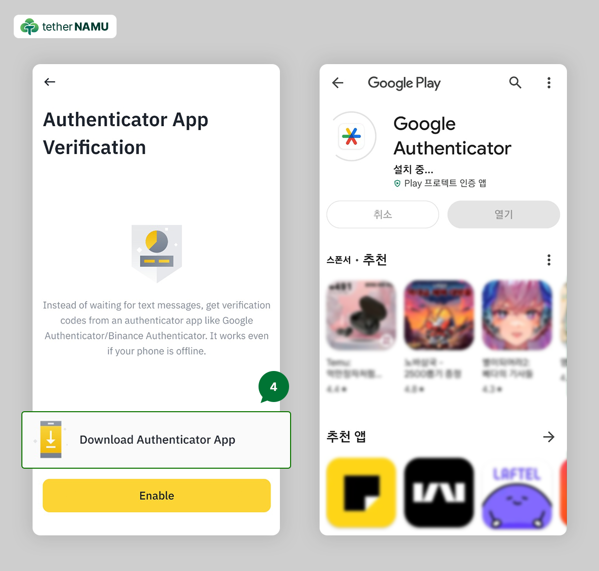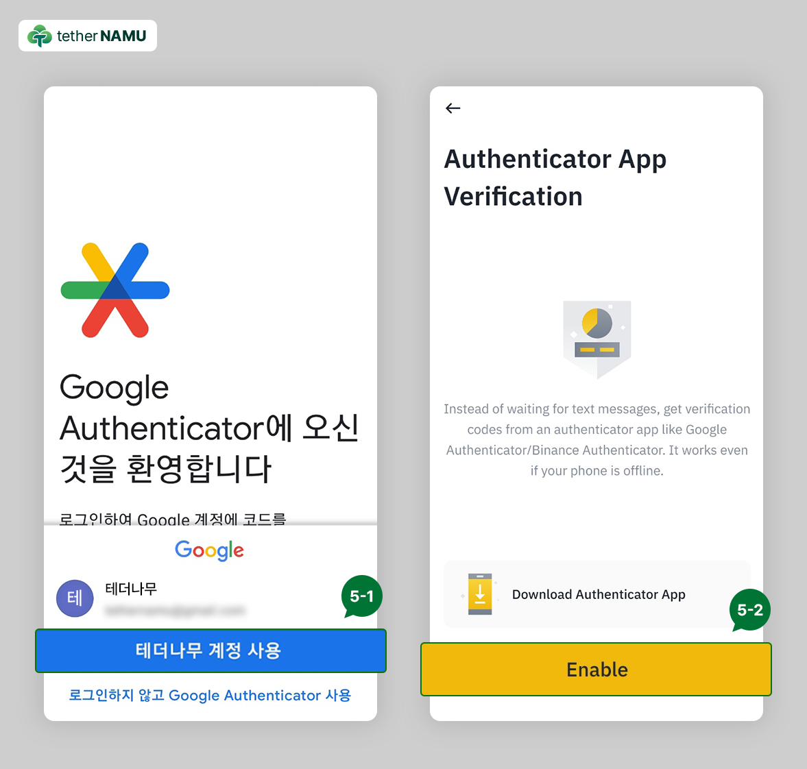 5. 사용중이신 구글 계정으로 방금 설치한 인증 앱에 로그인 후, 다시 바이낸스 어플 화면으로 돌아가서 Enable을 클릭해 주세요.
