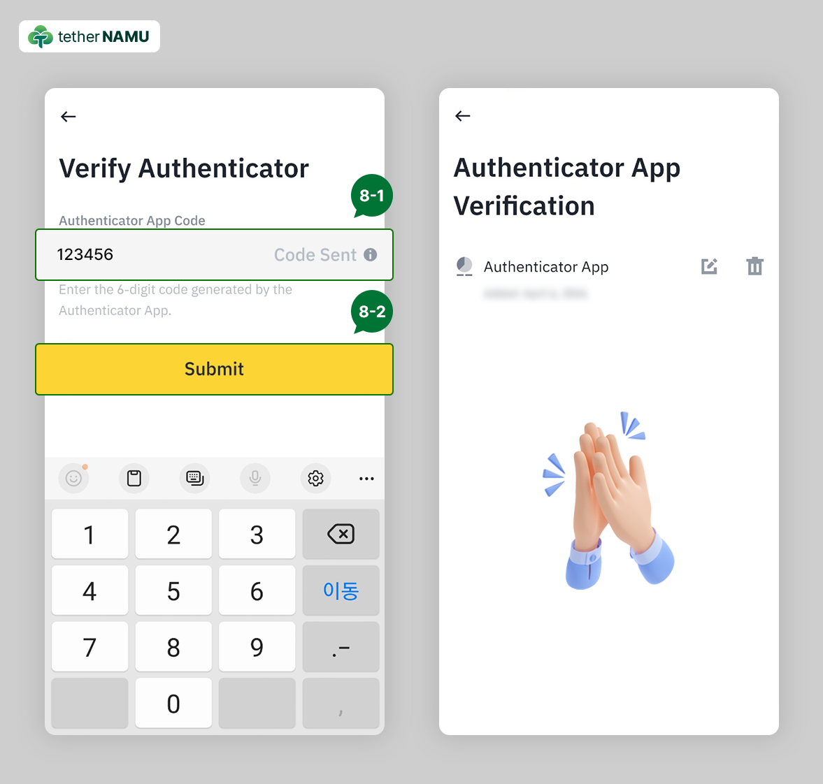 8. 바이낸스 어플로 다시 돌아가서, 생성된 OTP 키를 입력 후 다음과 같은 화면이 보인다면 OTP 등록 완료!