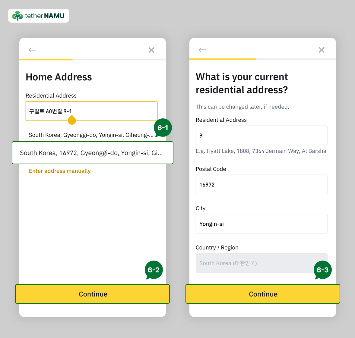 6. 신분증 상 주소지를 입력 후, 영문 주소를 선택해 주세요. 주소지가 맞다면 Continue를 한번 더 클릭해 주세요.