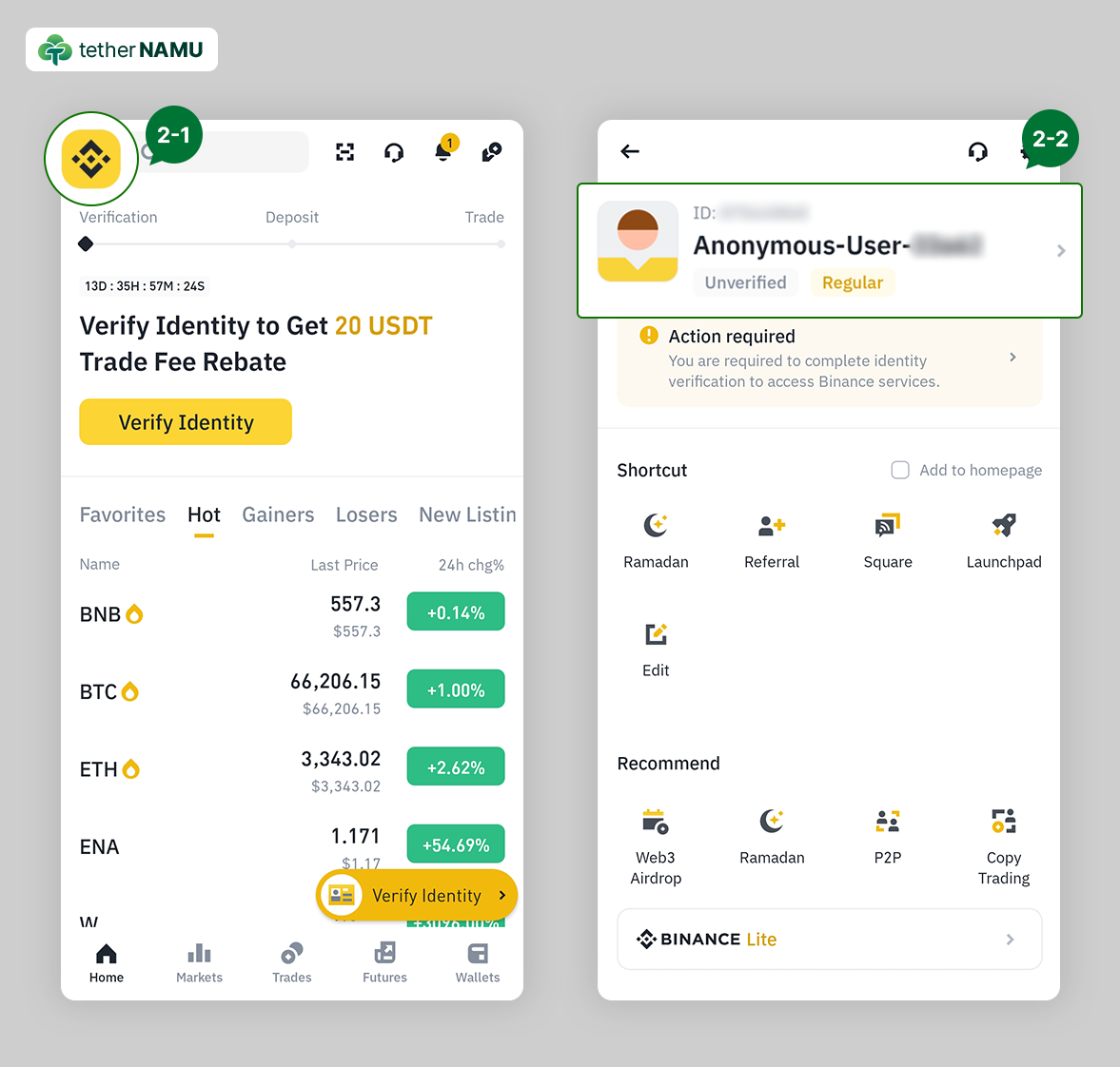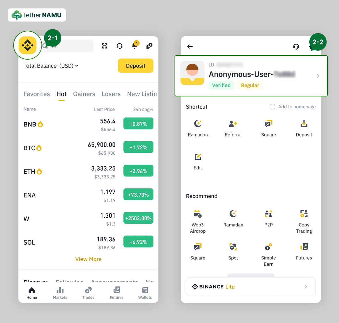 2. 좌측 상단 바이낸스 아이콘을 클릭 후 다음 페이지에서 사람 모양 아이콘 또는 본인의 프로필을 클릭해 주세요.