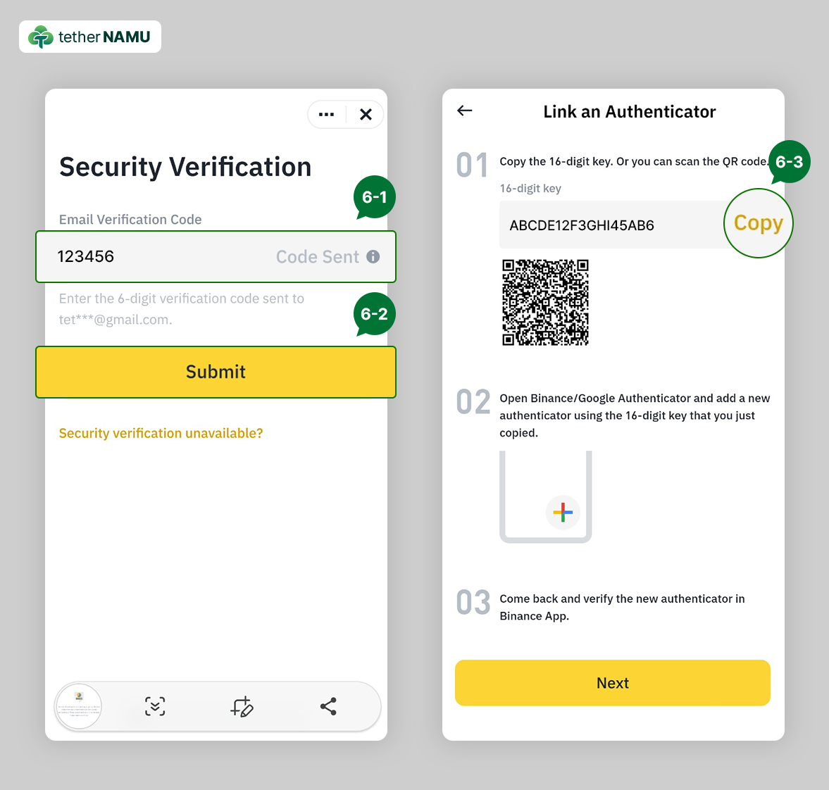 7. 인증 앱으로 다시 돌아가서 설정 키 입력을 클릭 후, 계정 세부정보 입력 란에서 계정 이름엔 바이낸스, 내 키에는 방금 복사한 16-digit key를 붙여넣고 추가를 클릭해 주세요.