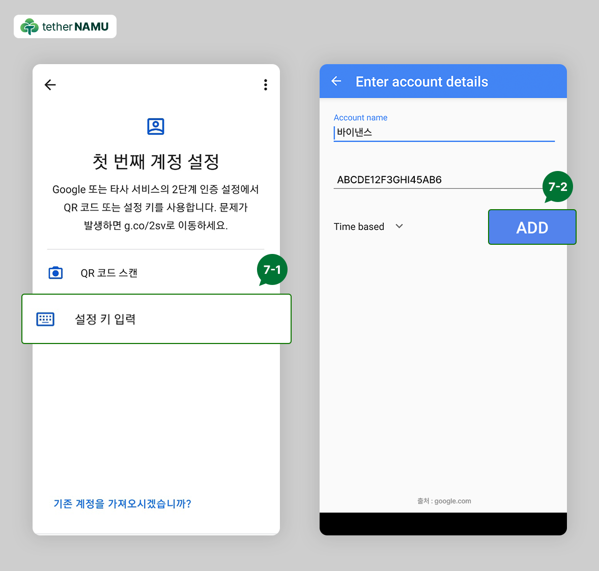 7. 인증 앱으로 다시 돌아가서 설정 키 입력을 클릭 후, 계정 세부정보 입력 란에서 계정 이름엔 바이낸스, 내 키에는 방금 복사한 16-digit key를 붙여넣고 추가를 클릭해 주세요.